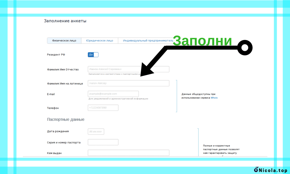 - Регистрация домена без заполнения специальной анкеты с Вашими личными данными. Этого вообще не должно быть! При регистрации у официально аккредитованного регистратора домена, с Вас обязательно потребуют грамотное заполнение этой анкеты. Причем именно с Вашими паспортными данными.