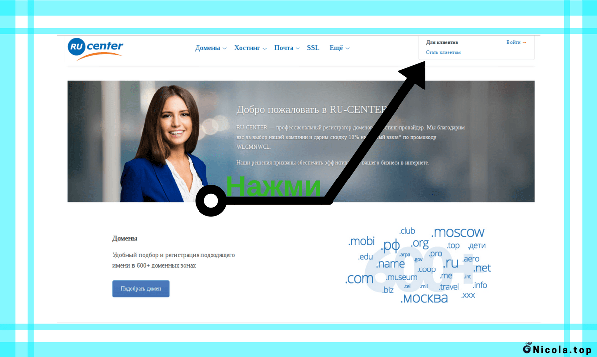 Этот регистратор на рынке уже давно. Плюс отлично себя зарекомендовал среди своих соперников. Я рекомендую Вам именно Ru-center, не в целях рекламы. Я сам пользуюсь услугами этого замечательного регистратора. Для регистрации на Ru-center, вам необходимо зайти на сайт и в правом верхнем углу нажать на ссылку стать клиентом.