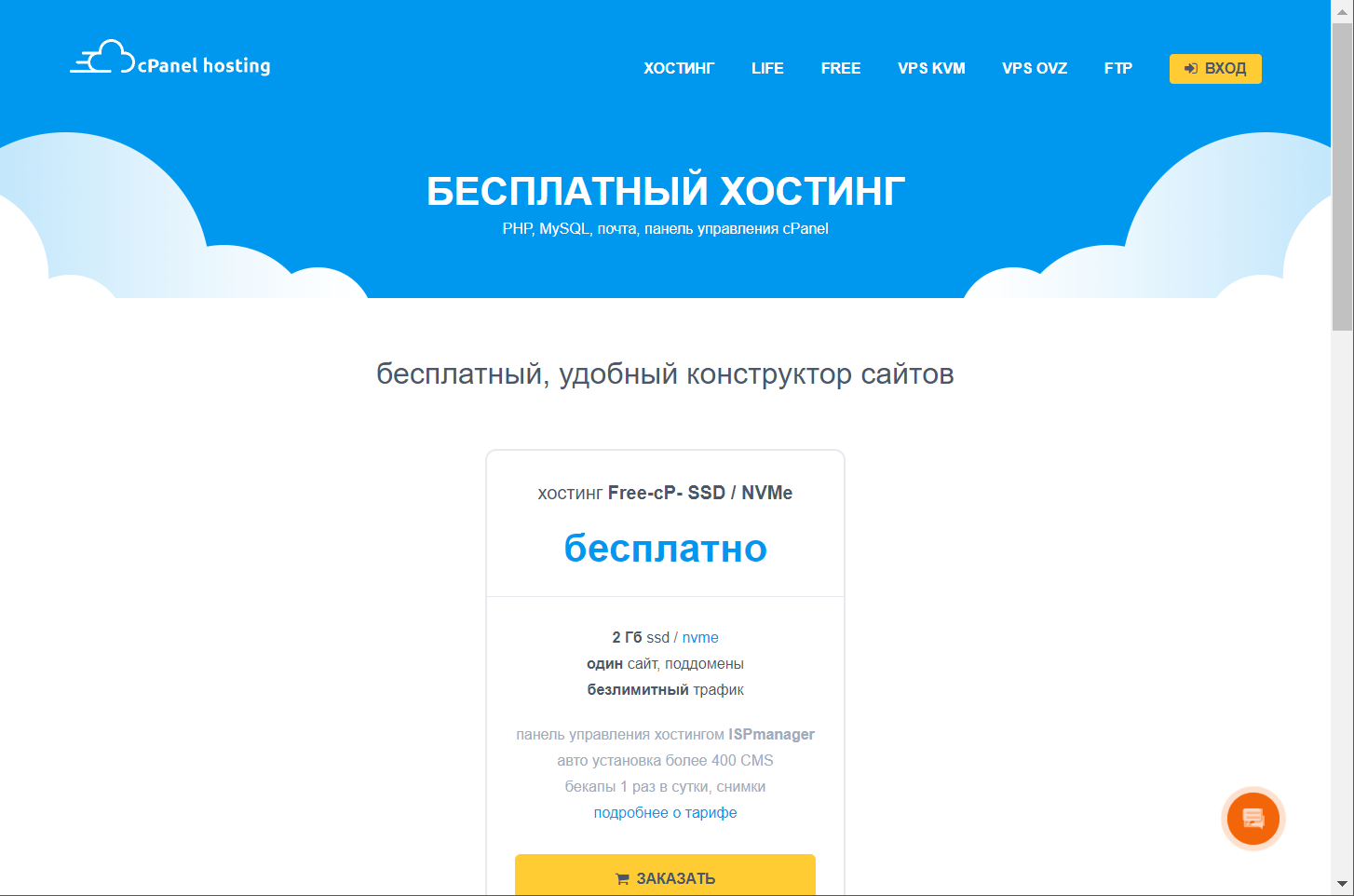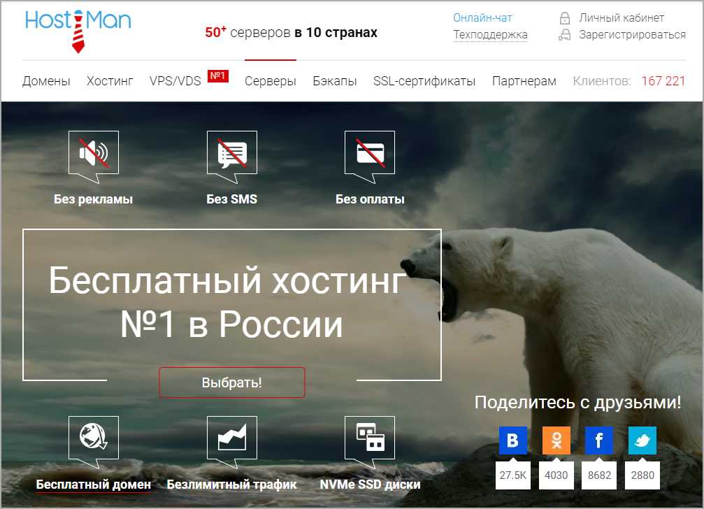HostiMan.ru — это бесплатный хостинг с конструктором сайтов без рекламы. За лайк. На бесплатном тарифе предоставляется 2 Gb SSD диска для 2 сайтов на современном сервере с DDR4. Используется панель управления ISPmanager 5 и Cloudlinux. Для установки из панели доступно 232 CMS и скриптов. В конструкторе сайтов более 170 готовых шаблонов дизайна. Предоставляется бесплатный домен 3 уровня вида сайт.h1n.ru, но можно подключать и свой домен 2 уровня. Бесплатные DNS серверы и backup, неограниченный трафик и выбор версии PHP 5.2-5.6. Доступны все функции и возможности платного хостинга: FTP, PHP, MySQL, phpMyAdmin, Cron и тд.