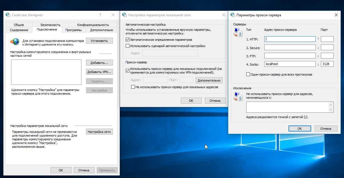 В поле «Настройка параметров локальной сети» нажмите на кнопку «Настройка сети». Отметьте пункты «Автоматическое определение» и «Использовать для локальных подключений». Нажмите «Дополнительно». В строке SOCKS укажите адрес localhost и порт 3128.
