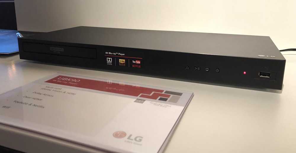 Основной «фишкой» данного устройства являются поддержка технологии Dolby Vision. Лаборатория Dolby Labs, занимавшаяся разработкой данного стандарта, совершила задел на будущее, ведь для того, чтобы реализовать технологию, у телевизоров должны быть соответствующие параметры. Результатом будет высокая чёткость, контрастность и яркость картинки, которые вкупе с хорошей аудиосистемой способны создать эффект кинотеатра. В остальном LG — это классический средний плеер, в плюсах у которого хорошая поддержка форматов, а вот в минусах — наличие из встроенных стриминговых сервисов только YouTube и Netflix.