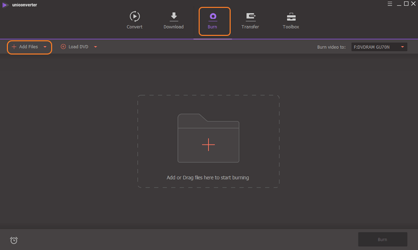 Перед началом работы вам нужно подключить устройство записи дисков Blu-ray к компьютеру и вставить в него пустой диск. Затем загрузите, установите и запустите Wondershare UniConverter на вашем ПК/Mac. Перейти к следующему Burn перейдите на вкладку и нажмите на кнопку добавлять файлы кнопка выбора видео, которое вы хотите записать на диск Blu-ray.