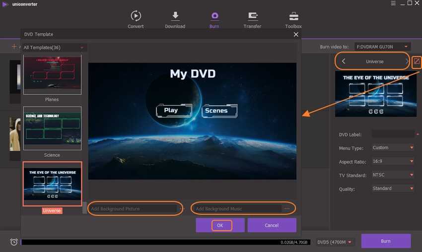 Выберите метку DVD, тип меню, стандарт телевизора и другие параметры, как вам нравится, на правой панели.