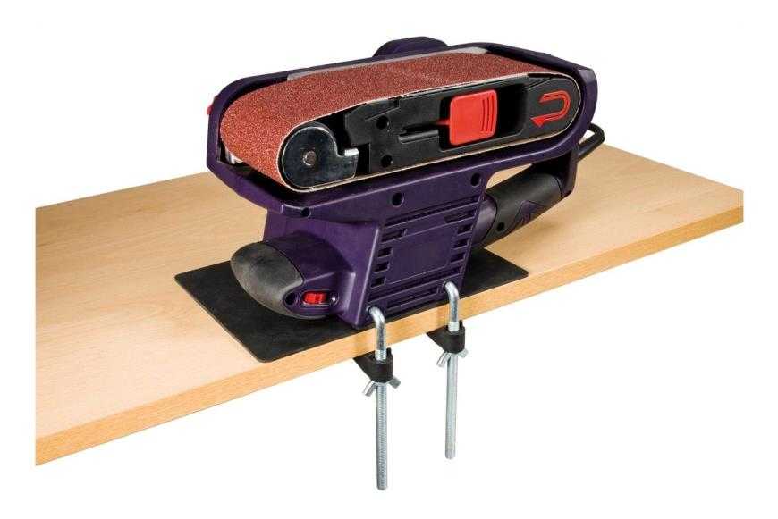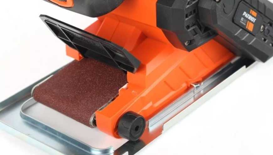 У инструмента есть рукояти для удержания, некоторые модели оснащены мешком-пылесборником. Многие электрошлифовальные машинки имеют специальные ограничители, которые позволяют контролировать глубину шлифовки материала. Устройство может быть оснащена струбцинами, которые позволяют закреплять ее рабочей лентой вверх.