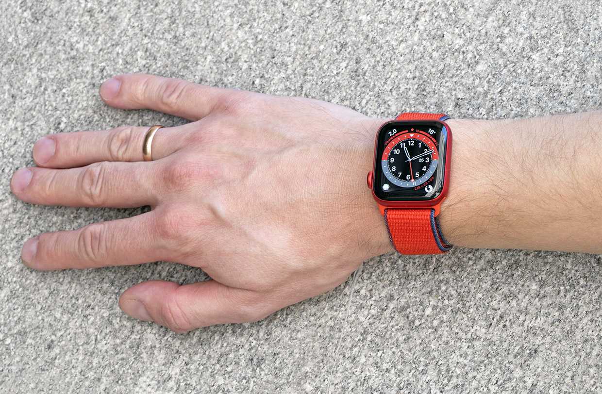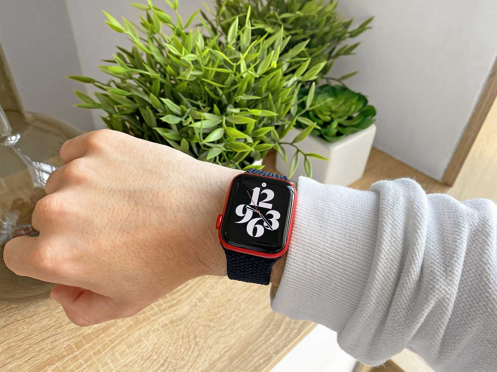 Плетёный монобраслет угольного цвета и красные Apple Watch Series 6, фото из обзора