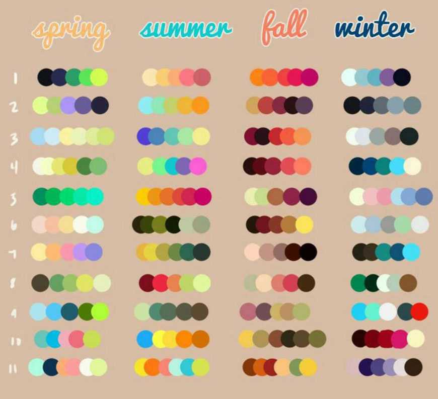 Следующая схема поможет в выборе цветов маникюра в зависимости от времени года. Так, зимой преобладают холодные оттенки, осенью теплые, отражающие все цвета опадающий листвы — желтые, пурпурные, коричневые.