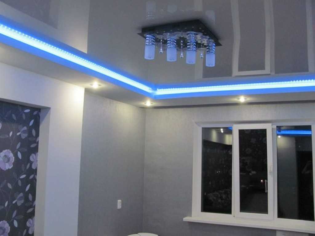 Наиболее простым в реализации вариантом является подсветка многоярусного потолка. На нём можно расположить ленты со светодиодами или же светильники точечного типа.