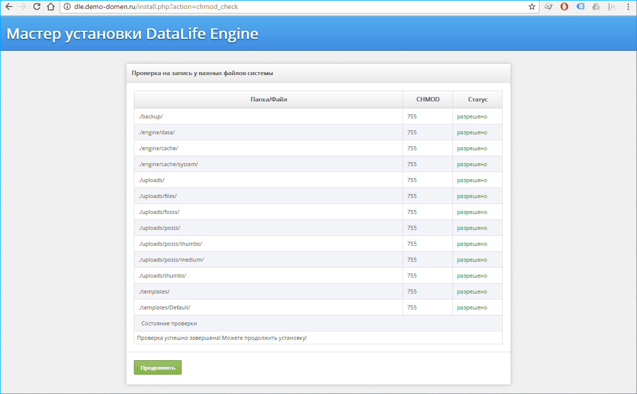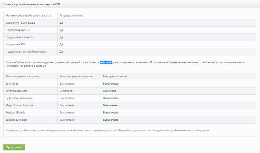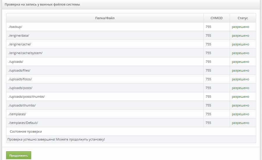 Если все в порядке – нажимаем «Продолжить». Если какое-то из требований не соблюдено – возможно, для корректной настройки сервера для установки DLE Вам потребуется обратиться в техподдержку Вашего хостинг провайдера.