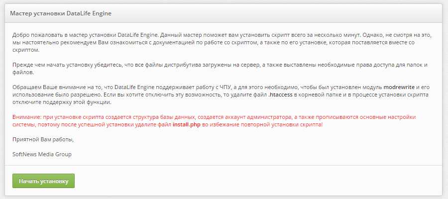 После копирования, набираем в адресной строке браузера http://ваш_сайт.ru/install.php. В версии DLE 10.4 появляется следующее окно: