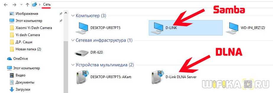 То же самое касается и сервера, запущенного на одном из компьютеров, расположенных внутри вашей локальной сети — если на нем запущен медиасервер, то он отобразится в списке как общий накопитель с открытым в него доступом, либо со входом по паролю, в зависимости от его настройки.