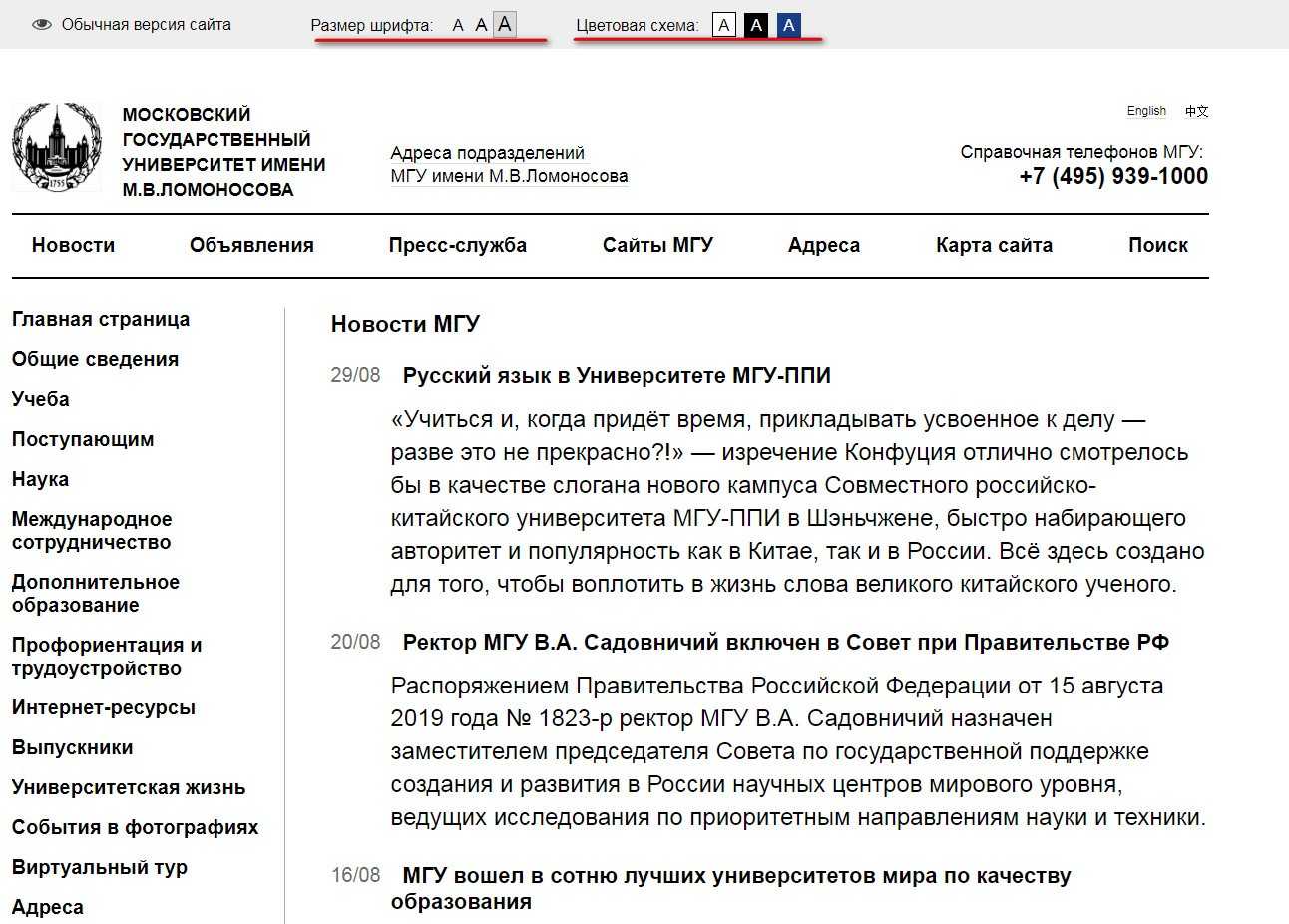 Вот так выглядит сайт МГУ им. М. В. Ломоносова в версии для слабовидящих.