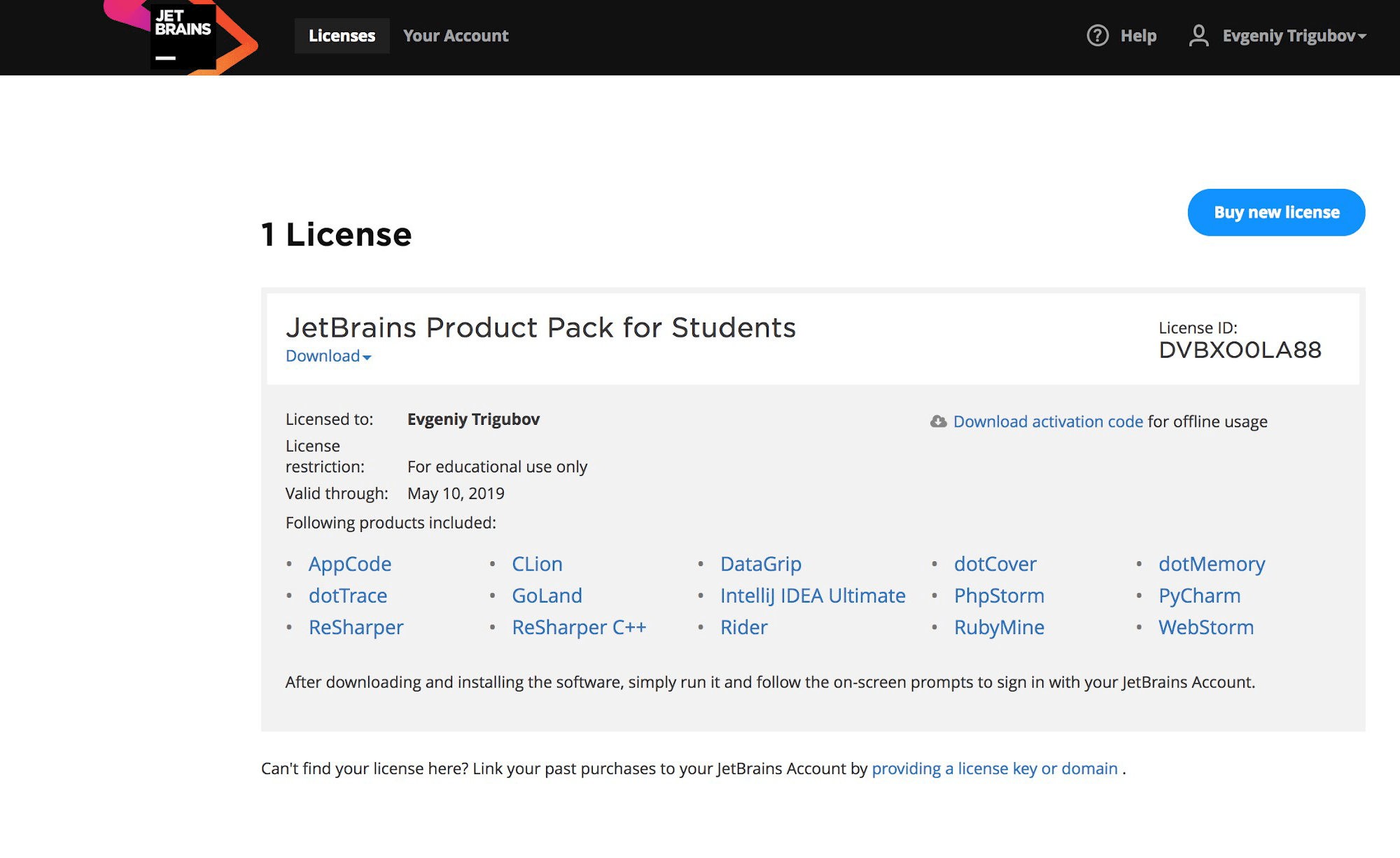 Студенческая подписка позволяет пользоваться всеми продуктами «Джет-брейнс» бесплатно в течение года. Я пользовался следующими программами: IntelliJ IDEA Ultimate для программирования на Java и Android, PyCharm Professional для языка Python и WebStorm для фронтэнд-разработки. Для других языков и целей программирования есть свои программы.