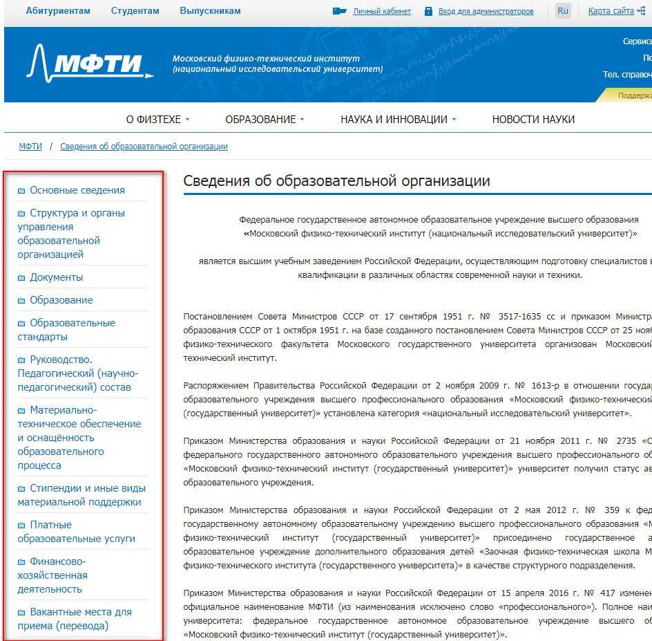 В соответствии с Приказом Рособрнадзора № 785 от 29.05.2014 на порталах должен быть специальный раздел «Сведения об образовательной организации». В нем должна содержаться информация в виде разных страниц или списка со ссылками на другие разделы. Доступ к спец. разделу должен быть как с главного меню, так и с других страниц.