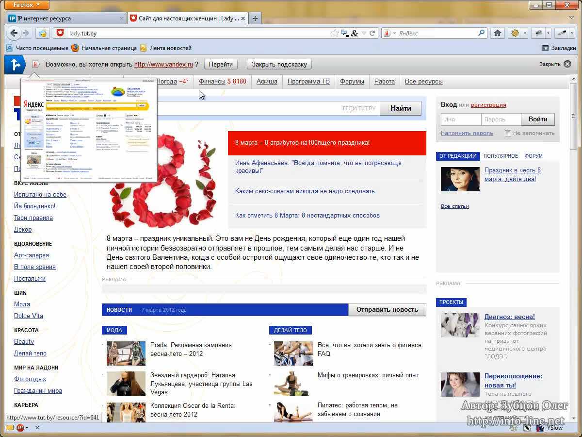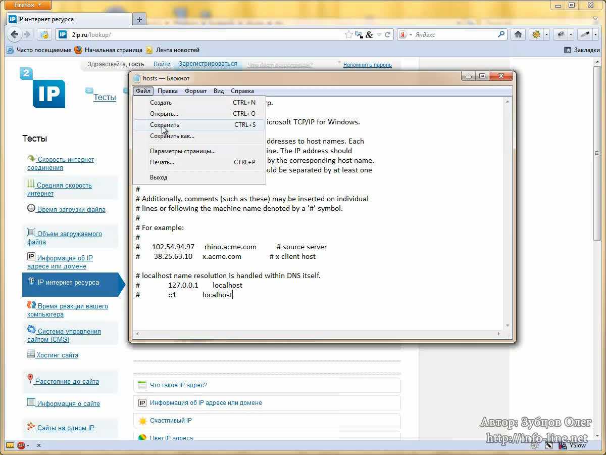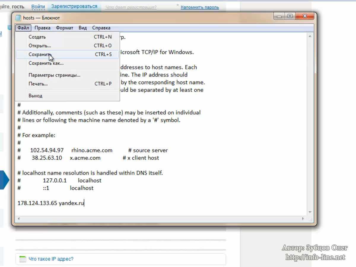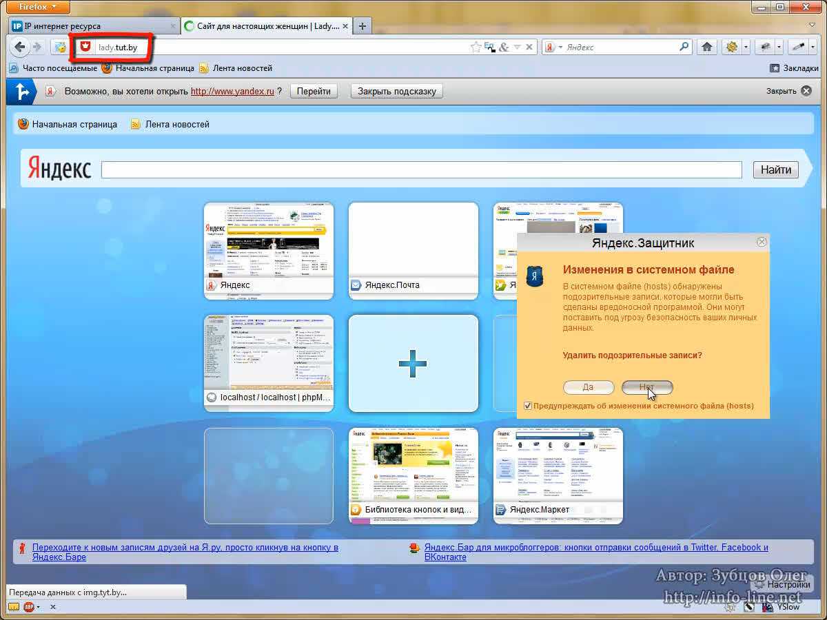 Давайте разберем пример. Для начала узнаем IP-адрес сайта. Это можно сделать также с помощью веб-сервисов, например, 2ip.ru (вкладка «IP интернет-ресурса»). Я ввожу сайт, например, tut.by (известный белорусский новостной портал). Я вижу IP-адрес, копирую его и вставляю в файл hosts. Теперь я ввожу сайт, например, yandex.ru. Таким образом, я ввел IP сайта tut.by, а название – yandex.ru. Сохраняю файл. А теперь пробую ввести в браузере yandex.ru. Как вы видите, я попал на сайт tut.by. «Яндекс.Защитник» предупреждает меня, что произошла замена файла hosts. Думаю, с этим понятно. Вирусы действуют примерно также. Они просто меняют сайт «ВКонтакте» на свой поддельный сайт «ВКонтакте», и, когда вы вводите там логин и пароль, они крадут ваши данные. Я очищаю файл hosts, сохраняю и сворачиваю данный файл.