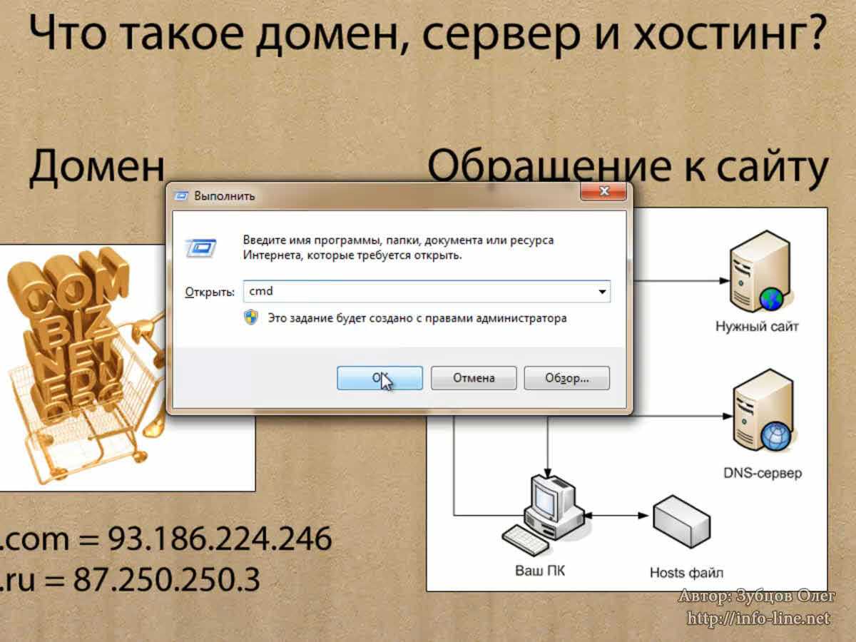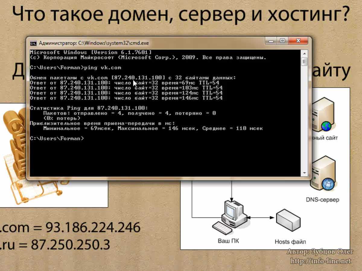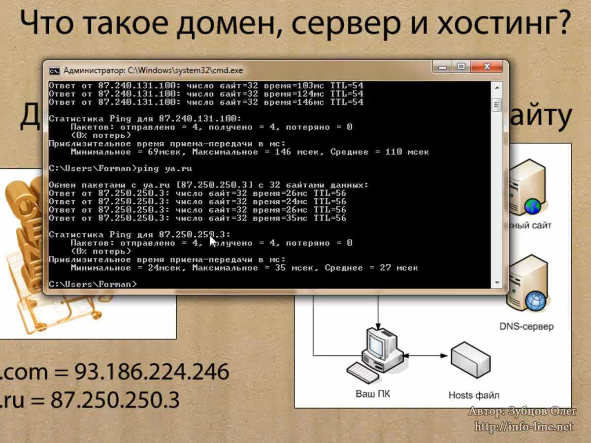 Как узнать IP-адрес? Нажмите сочетание клавиш «Windows» +R (клавиша «Windows» находится на вашей клавиатуре между левым Ctrl и левым Alt). У вас откроется окно. Введите в него cmd и нажмите «ОК». В появившемся консольном окне вводим ping vk.com. Жмем клавишу «Enter». Мы видим, что в квадратных скобках отображается IP-адрес сайта vk.com. Он уже не тот, что я вам показал на слайде. Дело в том, что сайт vk.com имеет очень много IP-адресов. Как я уже сказал, с этим мы разберемся позже. Давайте введем ping ya.ru. Здесь IP-адрес совпал. Введем сайт info-line.net. Получили 141.8.192.26. Вы можете проверить IPлюбого сайта. Также на одном IP могут располагаться несколько сайтов. Об этом мы тоже поговорим чуть позже. Я закрываю окно.