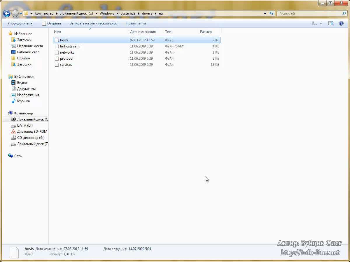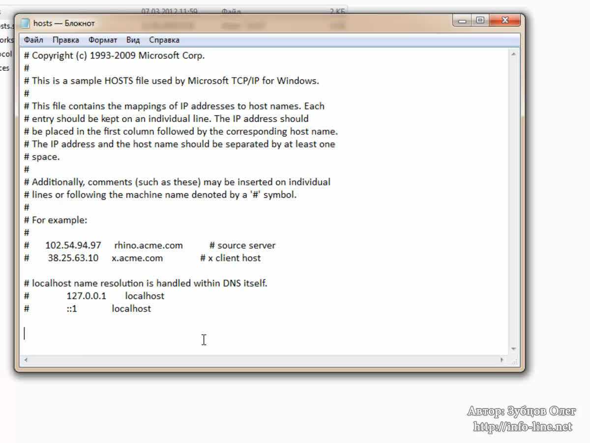 Давайте разберемся с файлом hosts.К нему компьютер также обращается перед тем, как выдать нужный сайт. Итак, где находится файл hosts? Он находится по адресу, на который установлена ваша система Windows (у меня это C:\Windows\System32\drivers\etc). Я его сейчас открою. Этот файл позволяет частично заменять DNS-сервер. Сначала вы прописываете IP, а потом – доменное имя. Если пользователь перейдет по этому доменному имени, то попадет на этот IP. Часто этим пользуются вирусы.