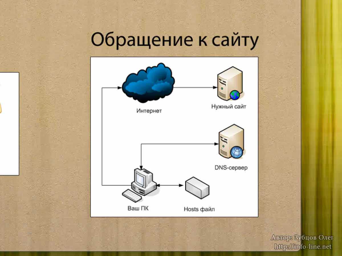 Давайте разберем, как происходит обращение к сайту. Посмотрите на схему. У вас есть персональный компьютер. Посредством модема он подключается к интернету. В адресную строку браузера вы вводите нужный вам сайт. После этого ваш компьютер подключается к DNS-серверу и к файлу hosts.