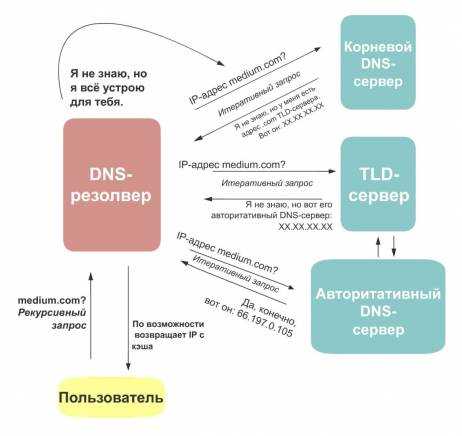 К примеру, если вы пытаетесь получить IP-адрес medium.com, то корневой доменный сервер выдаст адрес TLD-сервера для . Этот адрес корневой сервер вернёт резолверу. После этого резолвер опросит TLD-сервер. TLD-сервер может не знать нужный IP-адрес, зато он может дать адрес авторитативного DNS-сервера для .