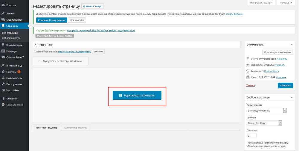 После установки и активации данного плагина на странице редактирования страниц и записей появится вот такая кнопка, при нажатии на которую запускается визуальный редактор Elementor