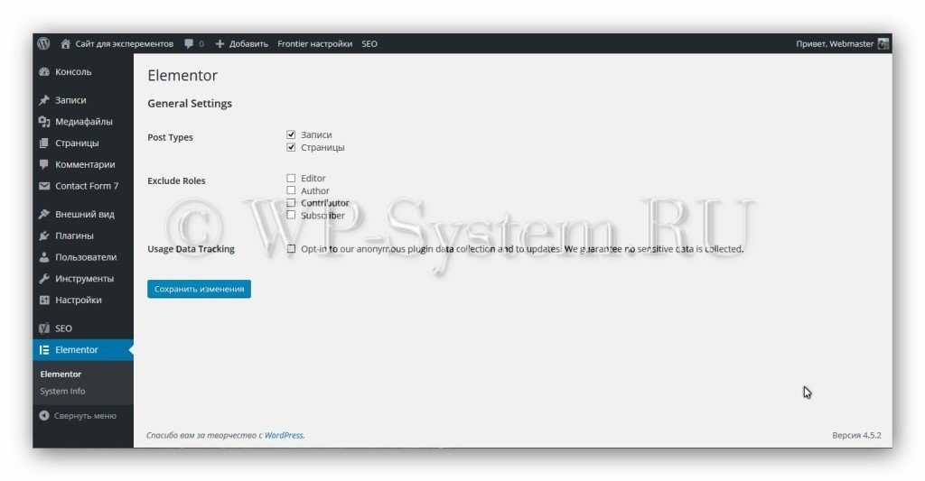 После установки плагина в консоли образуется пункт «Elementor». В нём, в разделе «Post Types» можно выбрать, в каких типах контента будет присутствовать дополнительный конструктор WordPress, а в раздел «Exclude Roles» можно отметить роли пользователей, для которых этот конструктор не будет доступен.