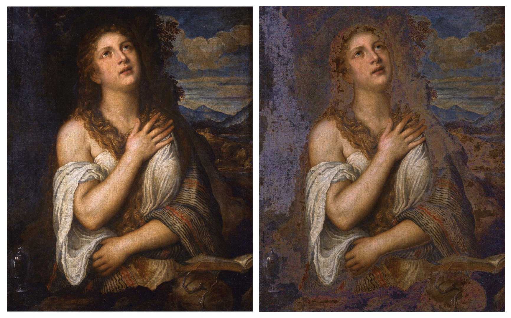 Давайте посмотрим на тональный контраст в живописи Тициана: слева оригинал, а справа — отредактированный вариант, в котором осветлён фон.