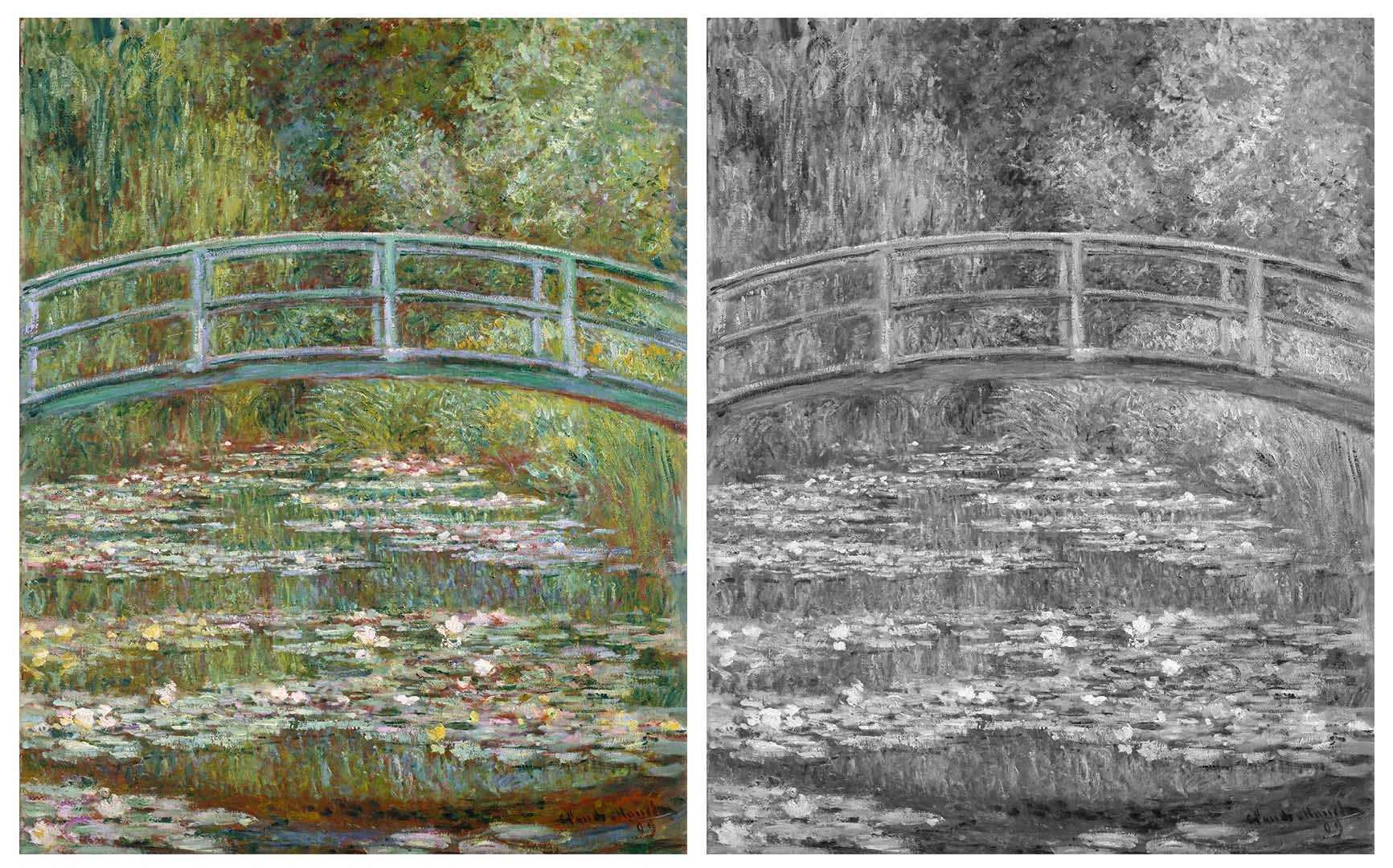 На оригинале за счёт сближенных по тону цветов чувствуется движение воздуха. В монохроме вся прелесть импрессионизма теряется.