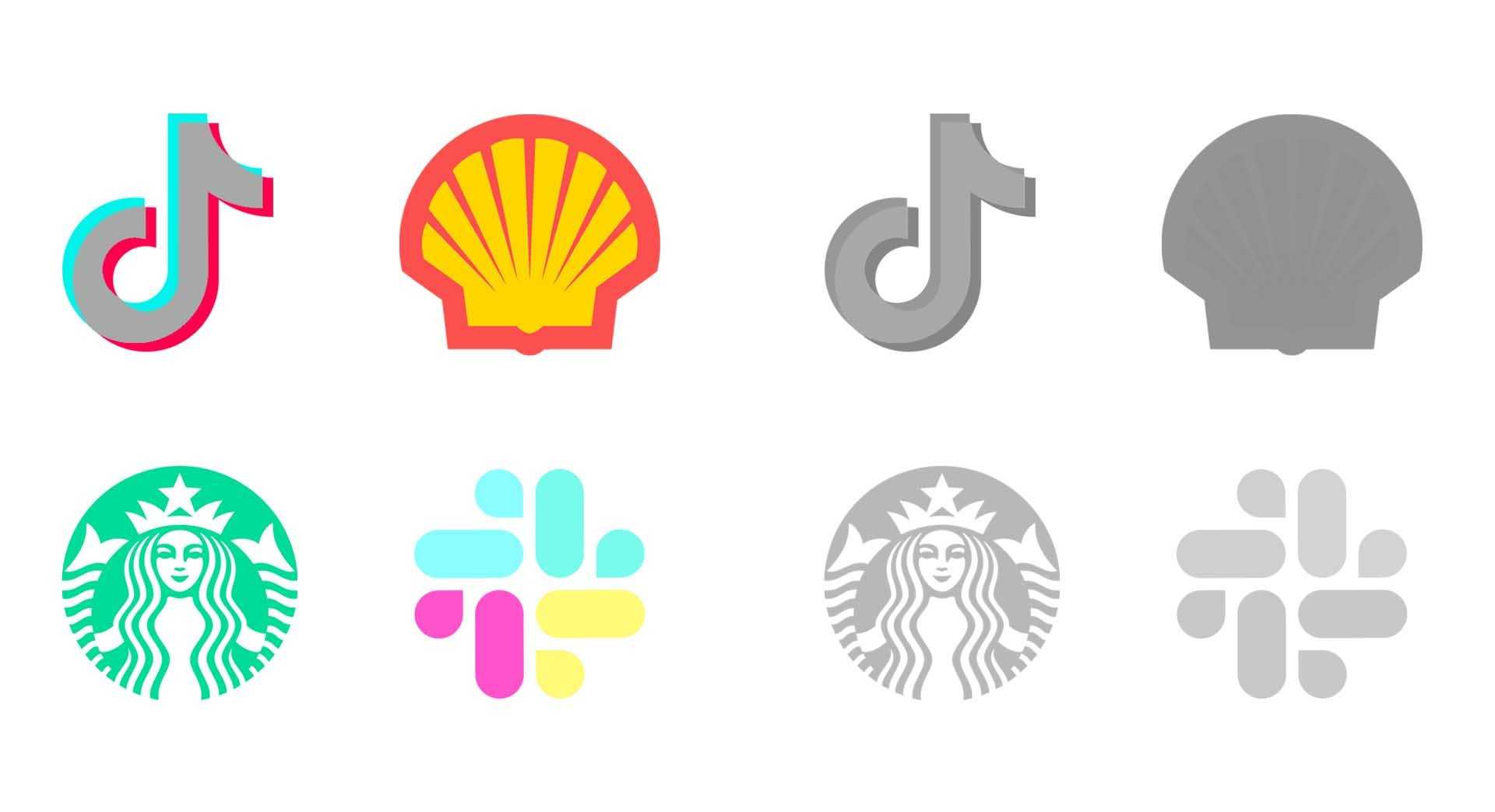 Логотипы Tik Tok и Shell слились в одно пятно, а Starbucks и Slack с трудом различимы на белом фоне.