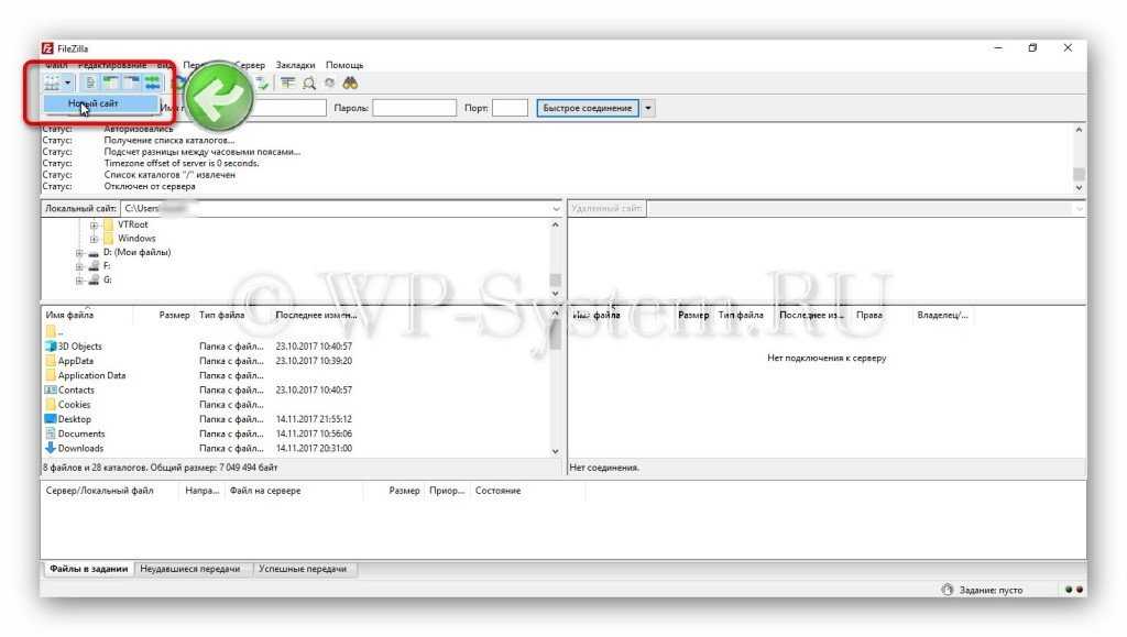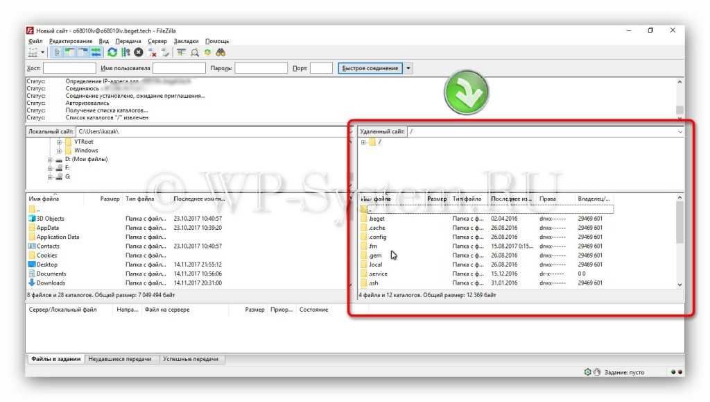 Для операций с файлами в FileZilla используются те же методы что и в самой Windows. Вы можете взять файл с вашего рабочего стола или из открытой папки с файлами и перетащить его в ту часть открытого окна FTP клиента, в котором находится содержимое на вашем удаленном сервере. Точно так же можно использовать функцию перетаскивания в обратном направлении. Т.е. «схватить» файл или папку из окна вашего удаленного сервера перетащить на рабочий стол или в папку. При этом происходит копирование объекта, который перетаскивается.