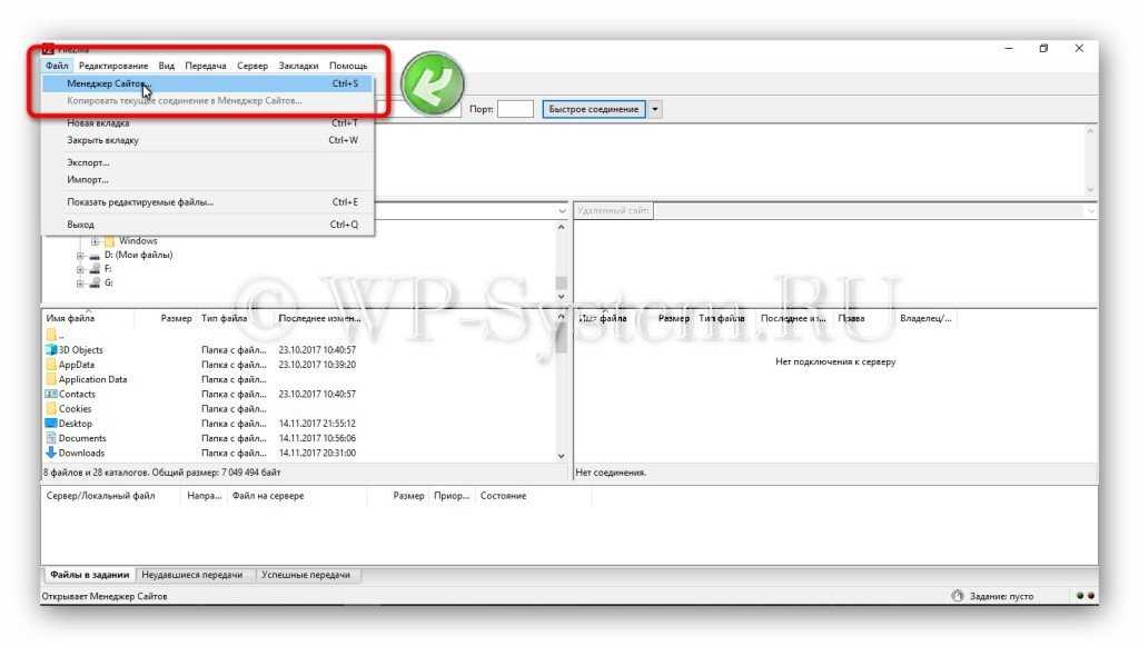 Для начал работы нажмите в верхнем меню «Файл», а затем нажмите на «Менеджер сайтов».