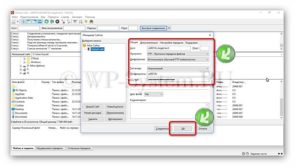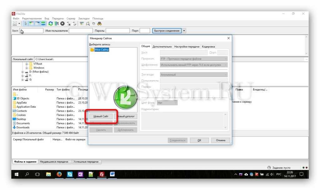 Вы увидите окошко, в котором можно создавать сайты, то есть подключения по FTP. Все подключения можно сортировать по каталогам. Один каталог уже создан по умолчанию — «Мои сайты». Вы можете создавать новые каталоги, нажав на кнопку «Новый каталог». А чтобы подключить Filezilla к хостингу, нужно нажать на кнопку «Новый сайт». Вы можете переименовывать все каталоги и сайты.