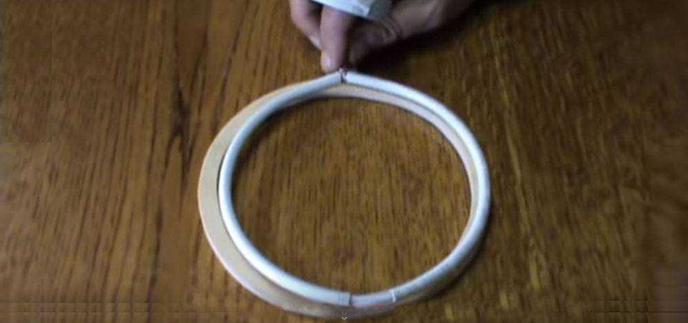 Это нужно для того, чтобы избежать деформации получившейся плоской антенны. Она накладывается на кольцо и закрепляется с помощью клея или изоленты, свободный конец кабеля прокладывается вдоль ножки. Сама же она крепится уже к подставке той конструкции, которую вы придумаете.