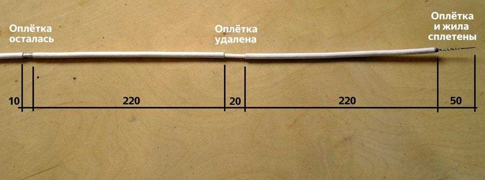 На расстоянии 750 мм от начала провода делается надрез с дальнейшим удалением пластиковой изоляции и сохранением целостности экранной оплётки. После разминания и ослабления оплётки, необходимо без повреждения медной жилы вывернуть экран по направлению к месту надреза изоляции.
