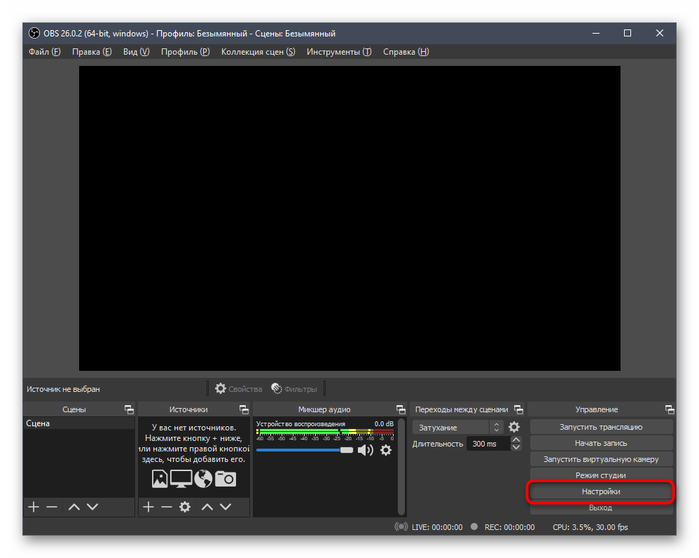 - Запустите программу (у нас это OBS) и вызовите ее настройки.