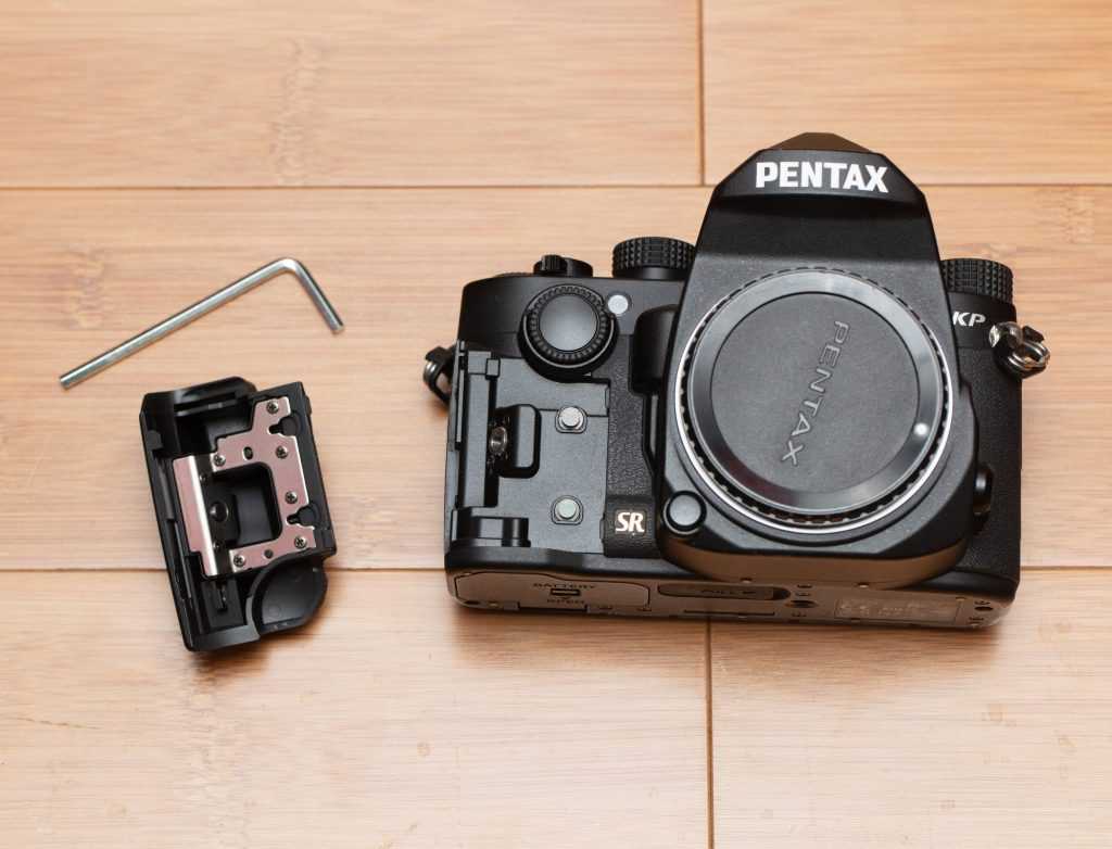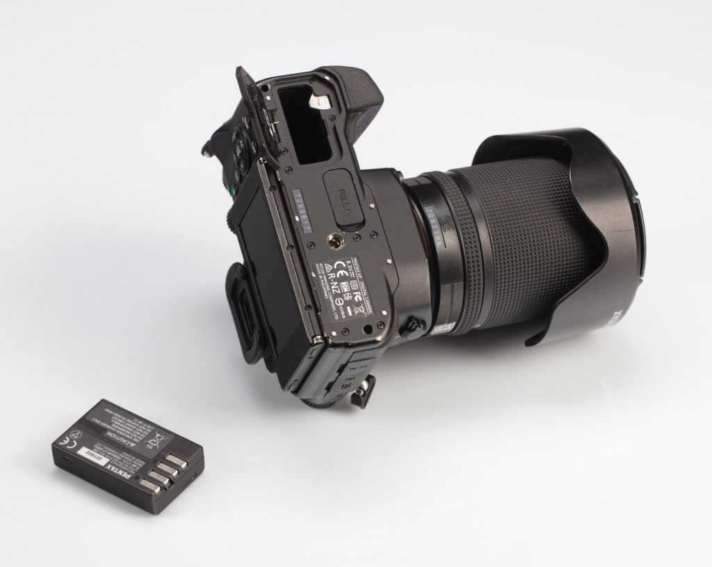 Камера Pentax KP предполагает компактность, а один из факторов делающих камеру больше — это габаритный аккумулятор. Здесь аккумулятор небольшой, но есть два варианта если важен большой ресурс работы — купить второй / третий аккумулятор или использовать батарейную ручку, резиновую заглушку под которую вы видите на нижней стороне камеры. Т.е. хоть камера и компактная — вам оставлен выбор эргономичного использования в длительных походах.