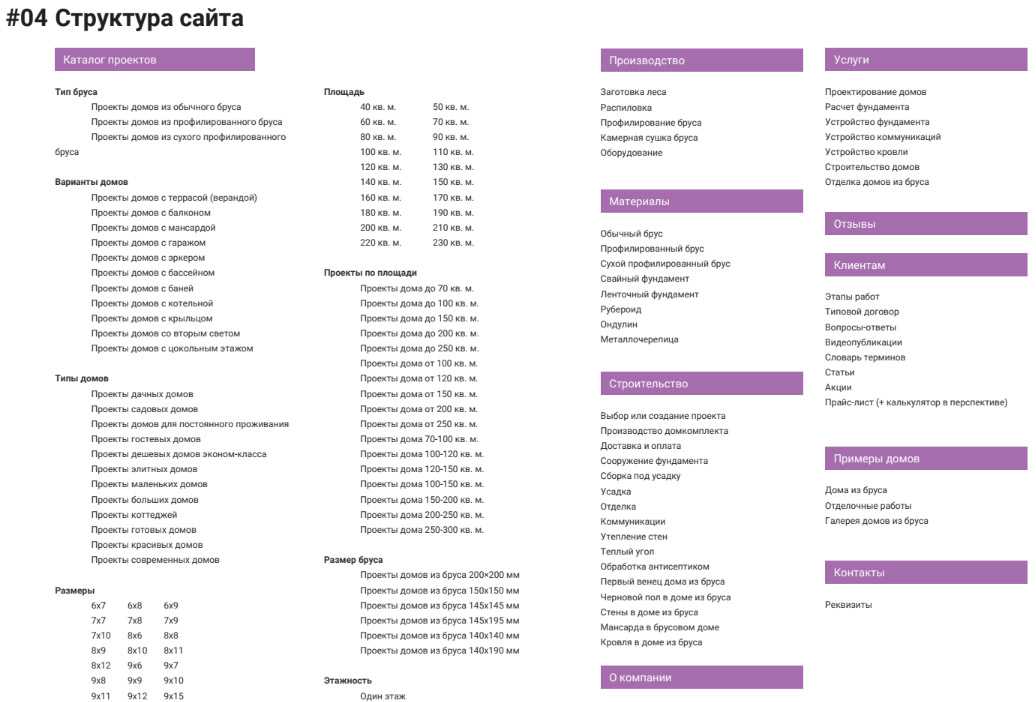 Пример стартовой структуры для сайта компании, которая строит дома из бруса. В дальнейшем количество подразделов будет непрерывно расти