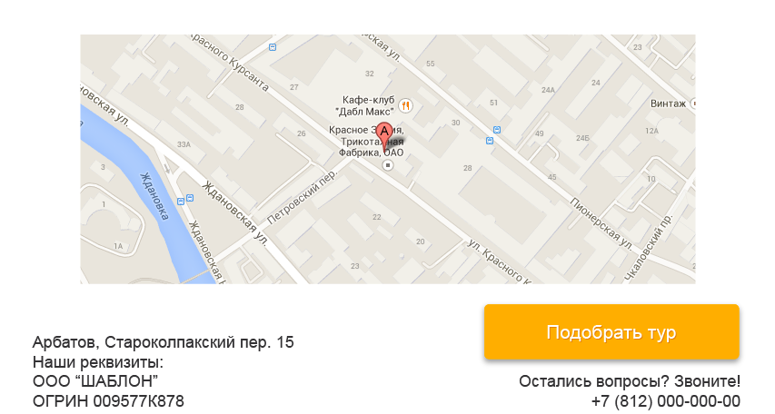 В нижней части страницы разместите Яндекс.Карту либо Google Maps и укажите точный адрес, например, «Москва, ул. Панферова, 8, офис 206». Пусть клиенты найдут вас быстро и без труда.