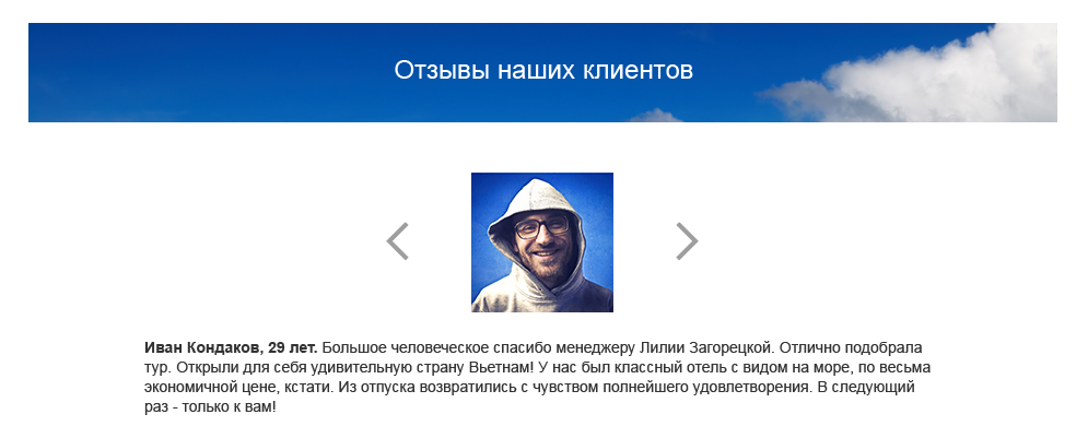 Добавьте мнения клиентов на ваш лэндинг — услуги, которые вы предоставляете, наверняка кто-то оценил по достоинству. Разместите фотографию клиента и небольшой текст. Пользователи всегда доверяют больше сайтам, где размещены мнения о компании или товаре.
