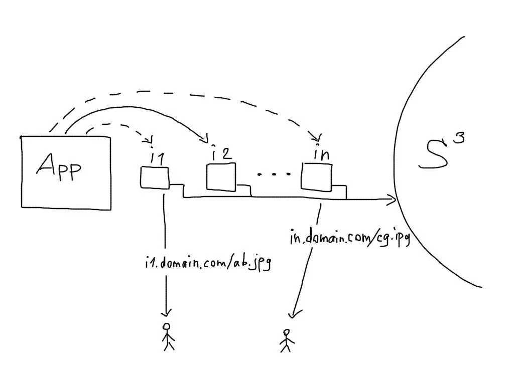 Для того, чтобы на каждом картиночном сервере не дублировались файлы в кэше, следует разделить загрузку и отдачу на сабдомены:
