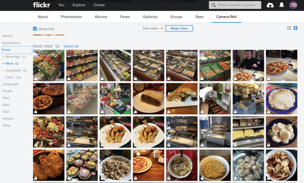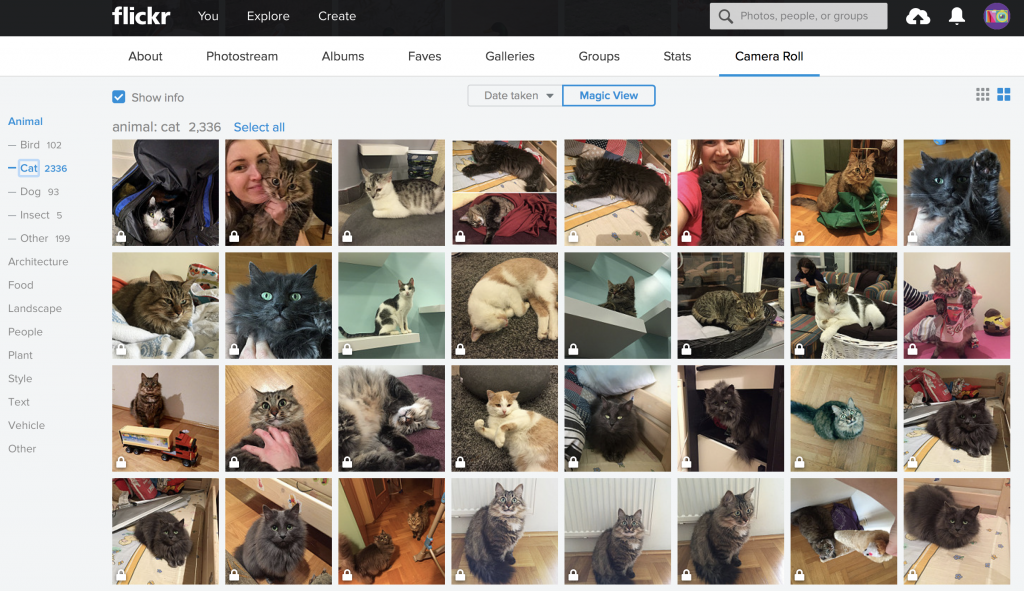 Веб-версия у Flickr удобная. Можно смотреть фото по дате, папкам, создавать коллекции, расшаривать друзьям для просмотра. Интересна опция Magic View: система распознает, что изображено на фото, и группирует снимки. Легко можно найти все кадры с птичками, котиками, людьми, архитектурой, вывесками и т.д. Впрочем, система нередко ошибается и показывает котиков в разделе птиц, котиков в разделе собак и т.д. Наверное, у меня слишком много котиков!