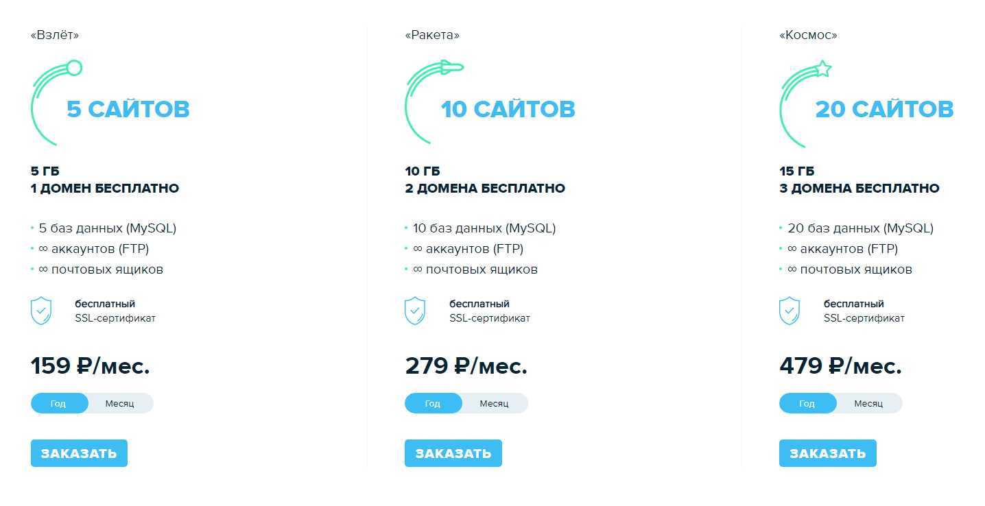 Лучший хостинг предлагает своим пользователям 4 тарифных плана, которые предусматривают различный объем дискового пространства, количество сайтов. Дополнительным бонусом для клиентов становится 3 резервных копии, дополнительные 10 Гб для почты, SEO, бесплатный перенос сайта с другой площадки, реклама в панели хостинга. При оплате годовой подписке в подарок предоставляется домен, 3 месяца бесплатного обслуживания для новых пользователей.