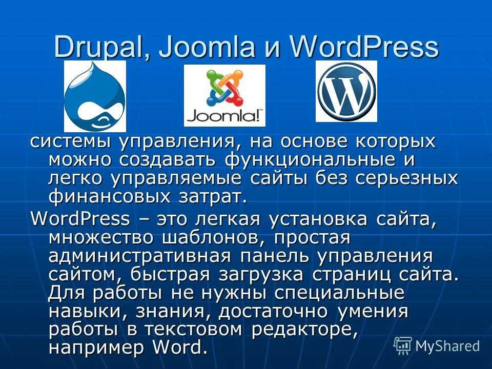 Drupal, Joomla и WordPress системы управления, на основе которых можно создавать функциональные и легко управляемые сайты без серьезных финансовых затрат. WordPress – это легкая установка сайта, множество шаблонов, простая административная панель управления сайтом, быстрая загрузка страниц сайта. Для работы не нужны специальные навыки, знания, достаточно умения работы в текстовом редакторе, например Word.