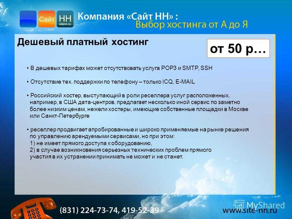 Дешевый платный хостинг В дешевых тарифах может отсутствовать услуга POP3 и SMTP, SSH Отсутствие тех. поддержки по телефону – только ICQ, Российский хостер, выступающий в роли реселлера услуг расположенных, например, в США дата-центров, предлагает несколько иной сервис по заметно более низким ценам, нежели хостеры, имеющие собственные площадки в Москве или Санкт-Петербурге реселлер продвигает апробированные и широко применяемые на рынке решения по управлению арендуемыми сервисами, но при этом: 1) не имеет прямого доступа к оборудованию, 2) в случае возникновения серьезных технических проблем прямого участия в их устранении принимать не может и не станет. от 50 р…