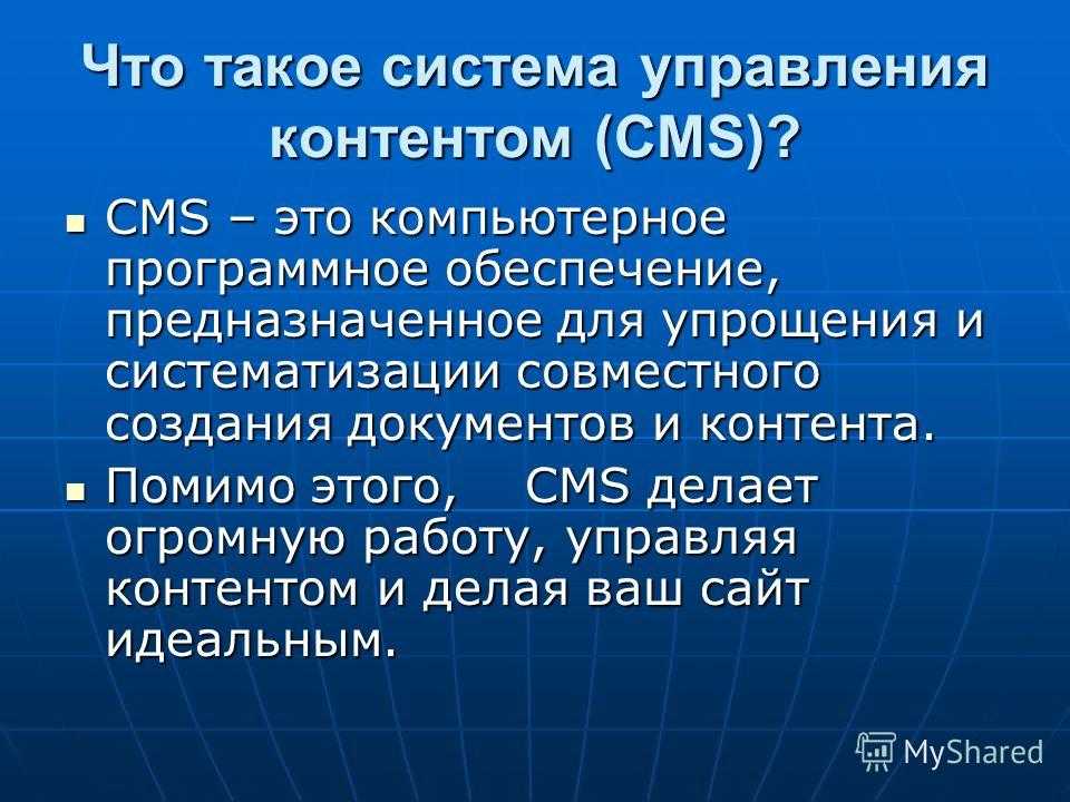 Что такое система управления контентом (CMS)? CMS – это компьютерное программное обеспечение, предназначенное для упрощения и систематизации совместного создания документов и контента. CMS – это компьютерное программное обеспечение, предназначенное для упрощения и систематизации совместного создания документов и контента. Помимо этого, CMS делает огромную работу, управляя контентом и делая ваш сайт идеальным. Помимо этого, CMS делает огромную работу, управляя контентом и делая ваш сайт идеальным.