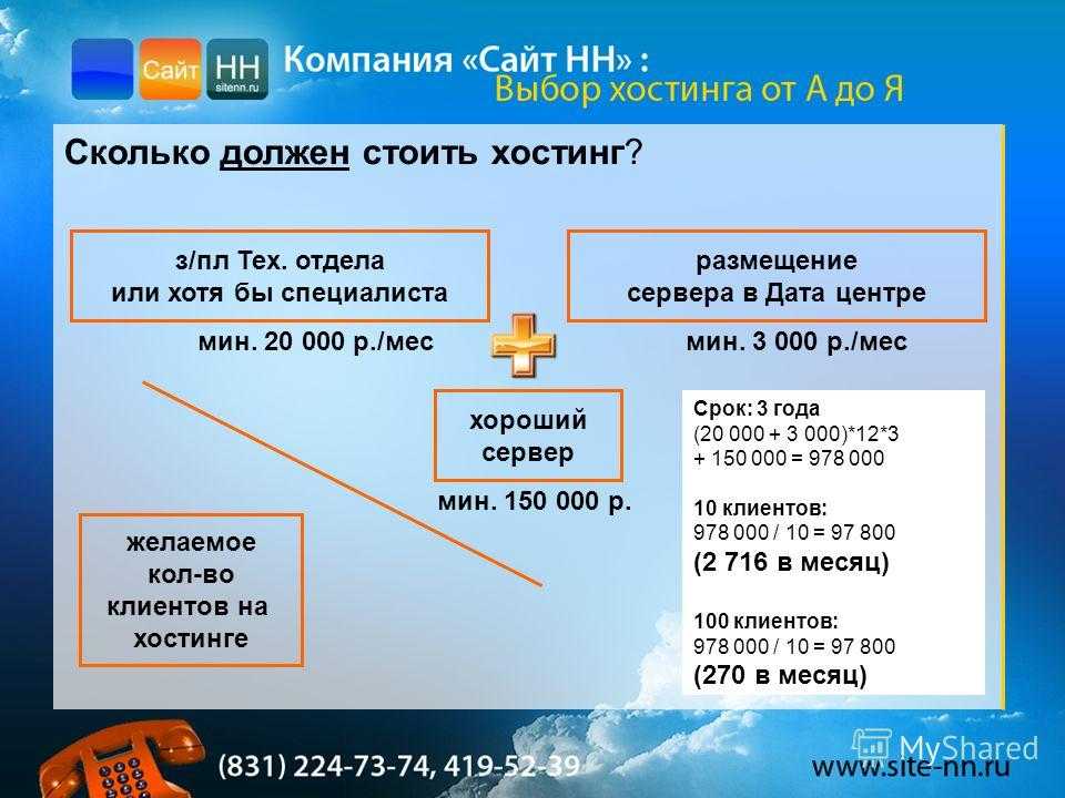 Сколько должен стоить хостинг? хороший сервер размещение сервера в Дата центре з/пл Тех. отдела или хотя бы специалиста желаемое кол-во клиентов на хостинге Срок: 3 года ( )*12* = клиентов: / 10 = (2 716 в месяц) 100 клиентов: / 10 = (270 в месяц) мин р./мес мин р. мин р./мес