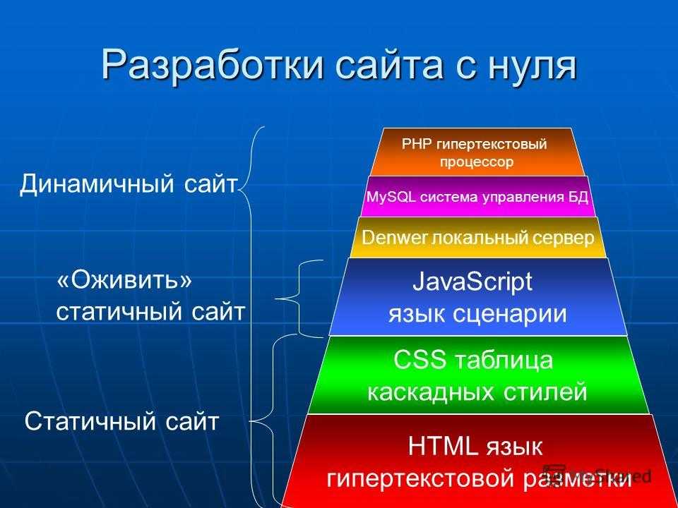 Разработки сайта с нуля HTML язык гипертекстовой разметки CSS таблица каскадных стилей Статичный сайт JavaScript язык сценарии PHP гипертекстовый процессор Denwer локальный сервер MySQL система управления БД «Оживить» статичный сайт Динамичный сайт