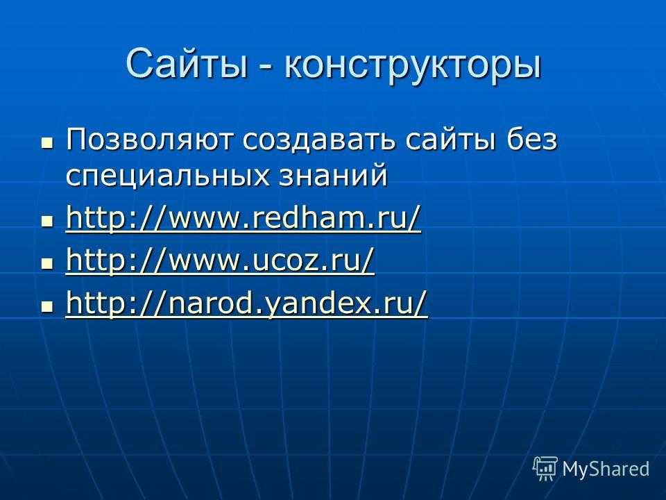 Сайты — конструкторы Позволяют создавать сайты без специальных знаний Позволяют создавать сайты без специальных знаний