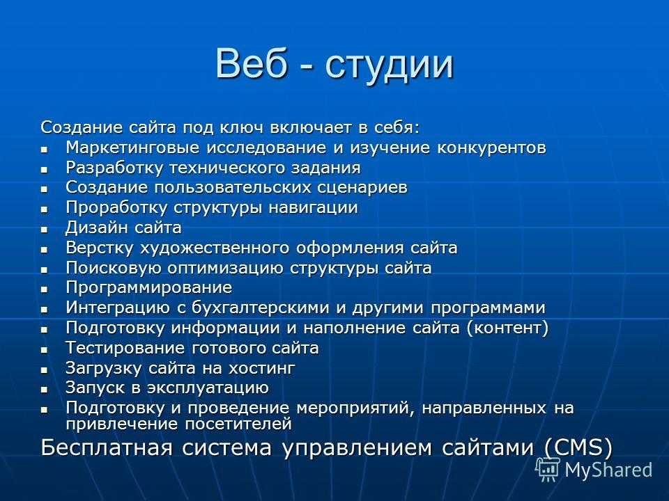 Веб — студии Создание сайта под ключ включает в себя: Маркетинговые исследование и изучение конкурентов Маркетинговые исследование и изучение конкурентов Разработку технического задания Разработку технического задания Создание пользовательских сценариев Создание пользовательских сценариев Проработку структуры навигации Проработку структуры навигации Дизайн сайта Дизайн сайта Верстку художественного оформления сайта Верстку художественного оформления сайта Поисковую оптимизацию структуры сайта Поисковую оптимизацию структуры сайта Программирование Программирование Интеграцию с бухгалтерскими и другими программами Интеграцию с бухгалтерскими и другими программами Подготовку информации и наполнение сайта (контент) Подготовку информации и наполнение сайта (контент) Тестирование готового сайта Тестирование готового сайта Загрузку сайта на хостинг Загрузку сайта на хостинг Запуск в эксплуатацию Запуск в эксплуатацию Подготовку и проведение мероприятий, направленных на привлечение посетителей Подготовку и проведение мероприятий, направленных на привлечение посетителей Бесплатная система управлением сайтами (CMS)