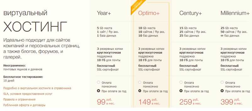 Тарифы на виртуальный хостинг достаточно привлекательны: один сайт обойдётся вам всего лишь в 99 р./мес. при годовой оплате, при этом компания предлагает: