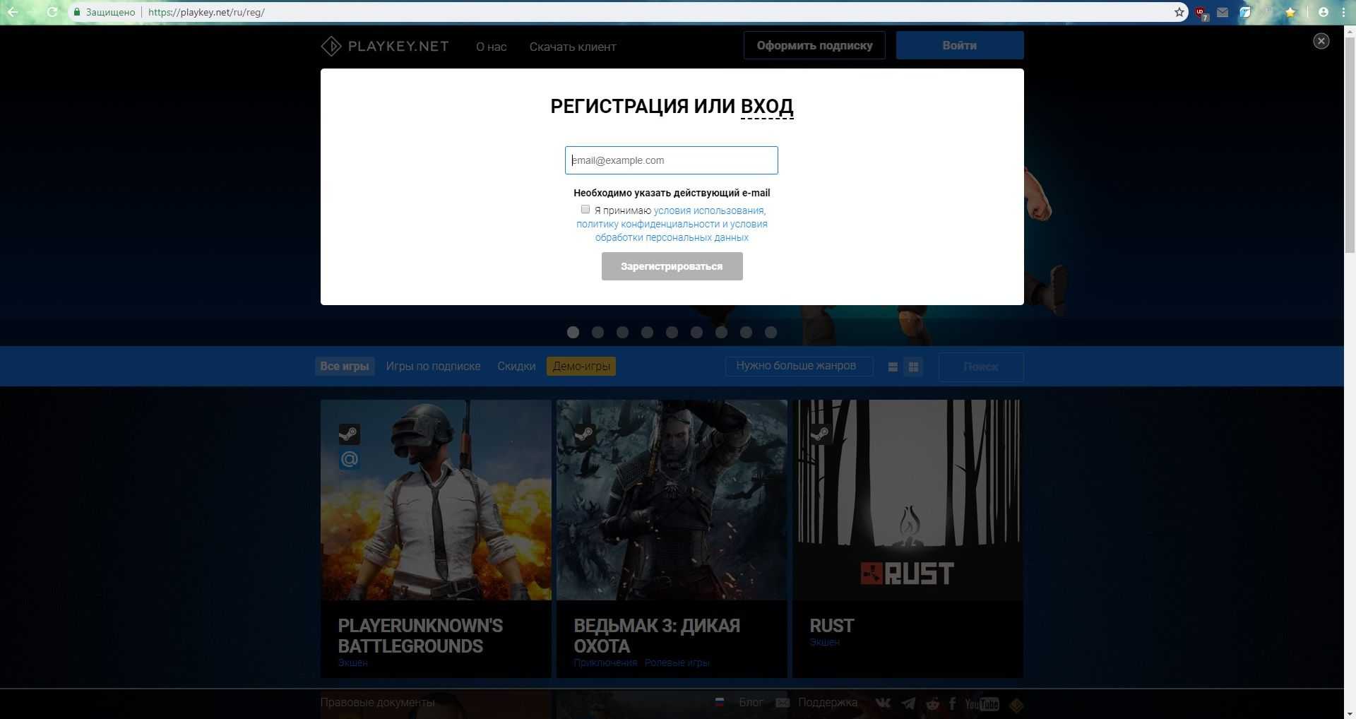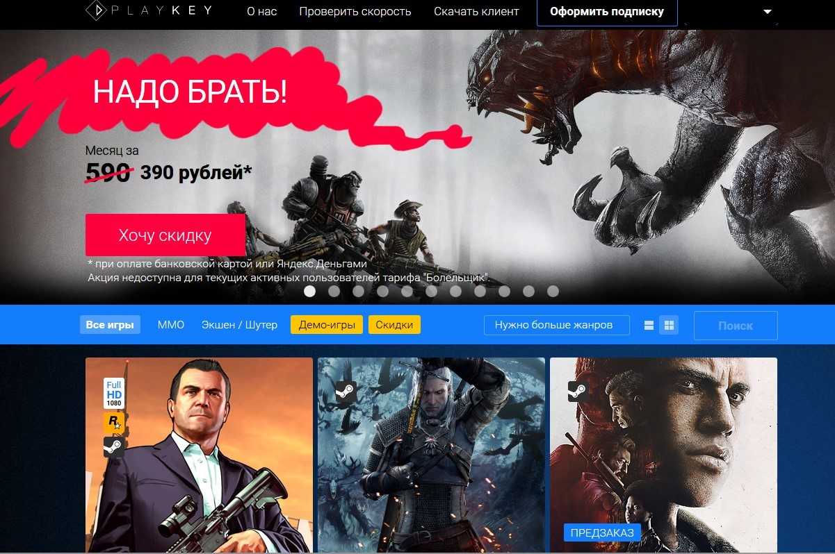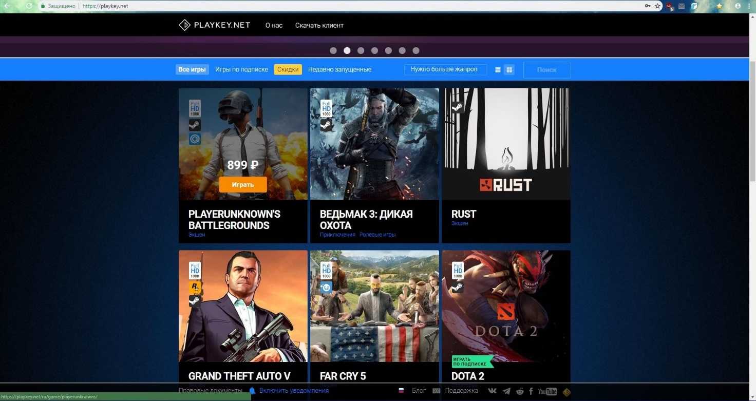 Сайт встречает нас лаконичным дизайном с демонстрацией доступных проектов на главной странице. Пощелкав по вкладкам, мы можем ознакомиться с информацией о создателях сервиса, скачать клиент необходимый для запуска игр, почитать отзывы о Playkey, обратиться в поддержку и так далее.