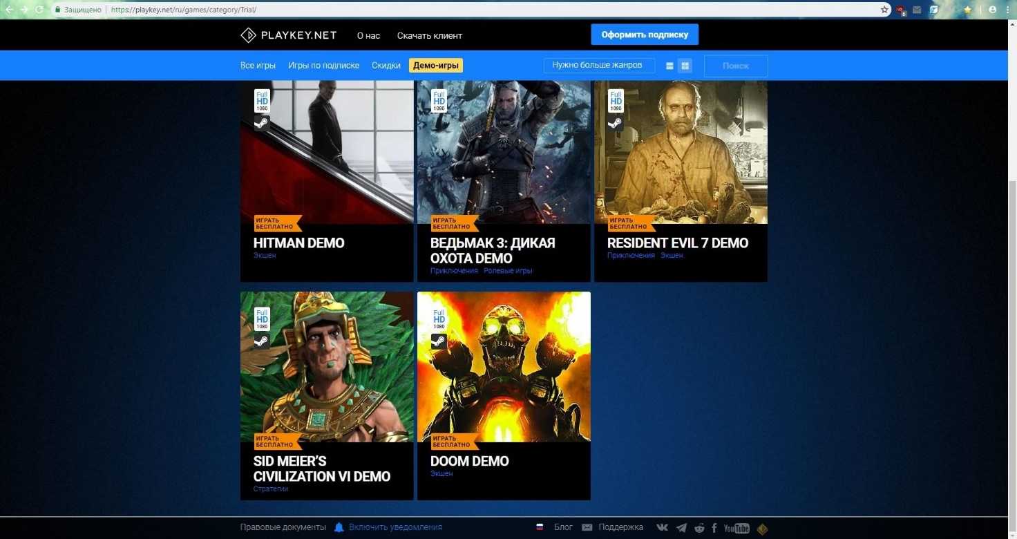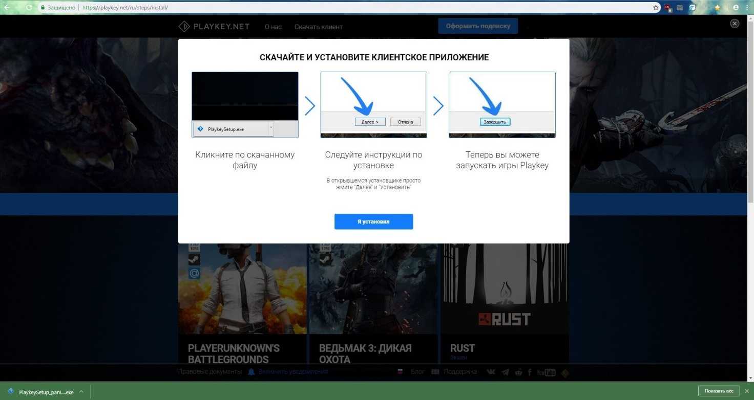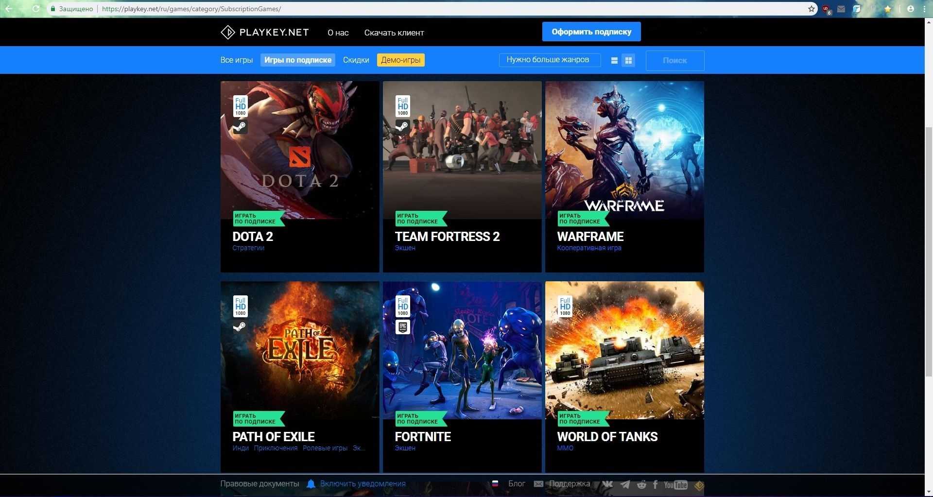 Сайт встречает нас лаконичным дизайном с демонстрацией доступных проектов на главной странице. Пощелкав по вкладкам, мы можем ознакомиться с информацией о создателях сервиса, скачать клиент необходимый для запуска игр, почитать отзывы о Playkey, обратиться в поддержку и так далее.